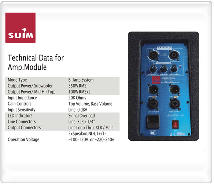 Bi-Amp System의 RMS 350W 의 Amp 가 장착된 앰프 내장형 Sub Woofer System 이다.